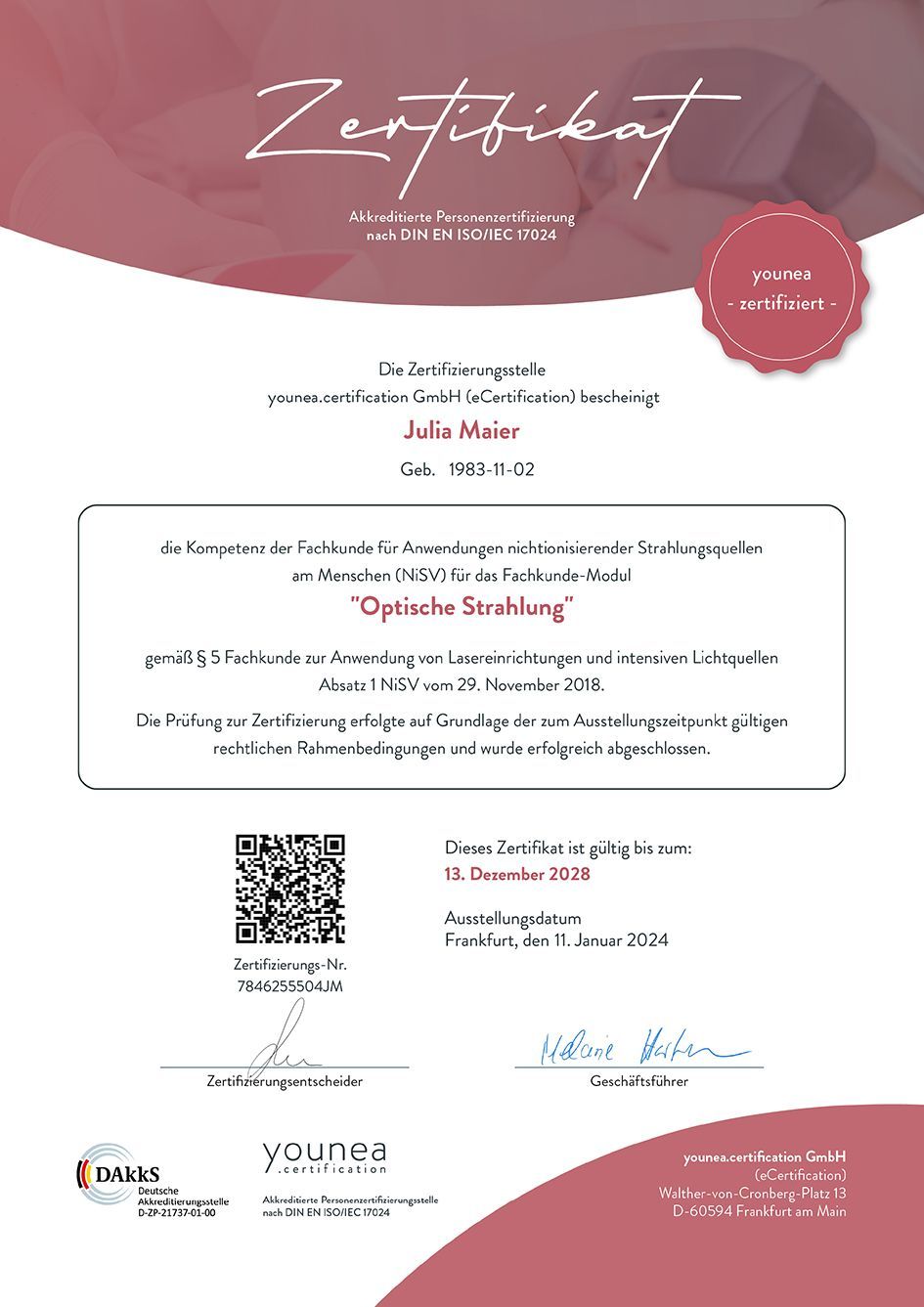 Als zertifiziertes Studio für dauerhafte Haarentfernung erfüllen wir die höchsten Standards der Qualität und Sicherheit. Unser Fachpersonal ist nach der NiSV (Verordnung zum Schutz vor nichtionisierender Strahlung) für das Fachkunde-Modul 'optische Strahlung' geschult und zertifiziert. Diese Zertifizierung ist nicht nur eine gesetzliche Verpflichtung, sondern auch ein Zeichen unseres Engagements für Ihre Sicherheit und Zufriedenheit. Vertrauen Sie auf unsere Expertise und Professionalität für eine sichere und effektive Haarentfernung.